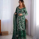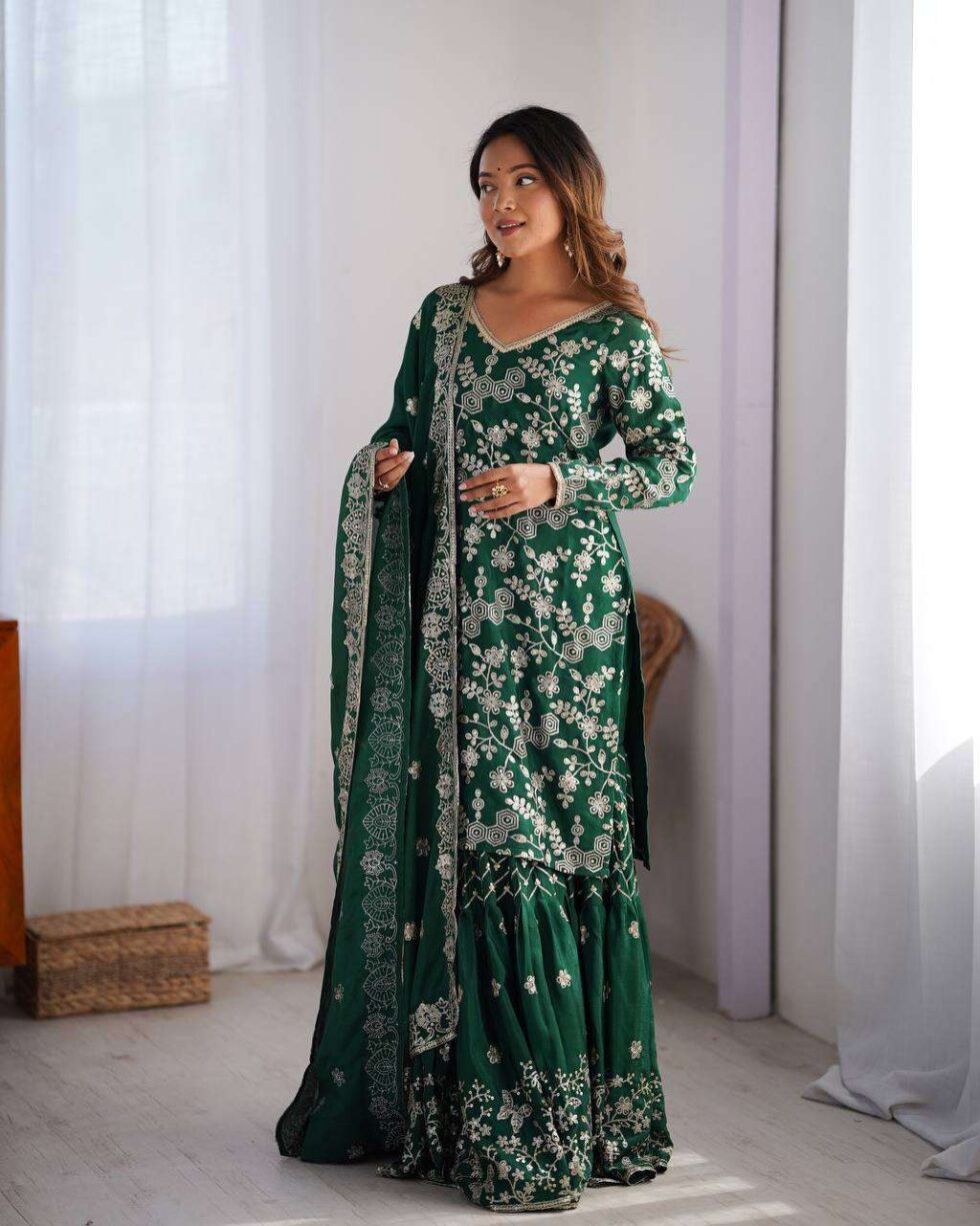 Women’s Chinon Silk Embroidery Sequence Work Straight Kurti With Sharara Suit and Dupatta Set